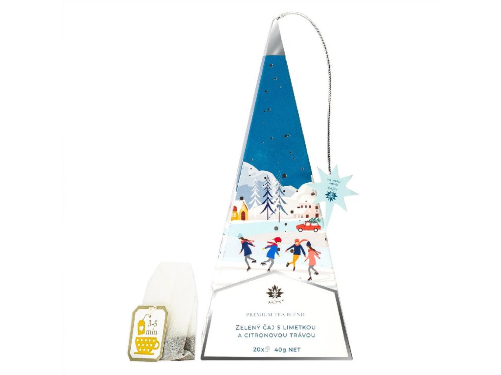 20 čajových sáčků s lahodným zeleným čajem ze Srí Lanky, ochuceným svěží kombinací limetky a citrónové trávy, je zabaleno v elegantní designové pyramidě s vánočním motivem.