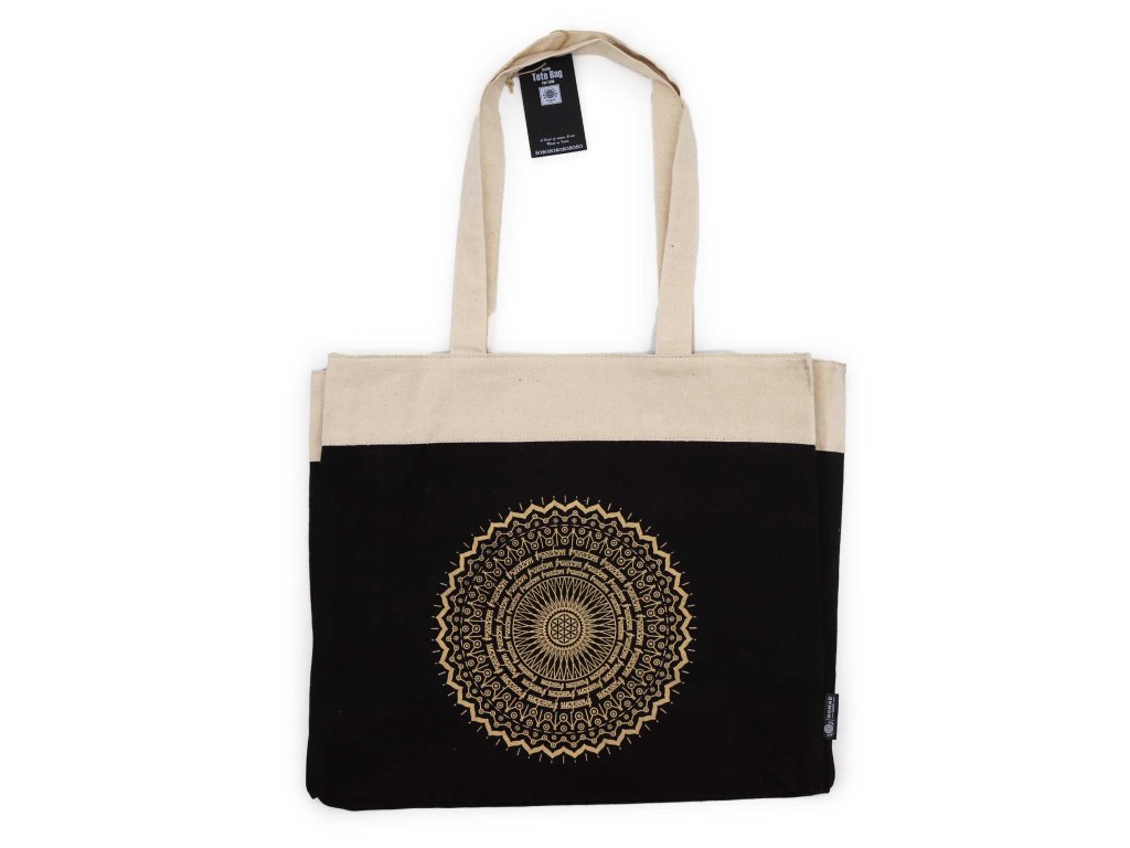 Vzor se zářícími liniemi obsahuje stylizované prvky sanskrtu a opakovaně zakomponované slovo „Freedom“ (Svoboda), čímž vytváří vizuálně působivý a kulturně hluboký design. Pevná bavlněná tkanina, přírodní uši a prostorný vnitřní prostor dělají z této tašky ideálního společníka pro každodenní používání nebo vědomý životní styl.