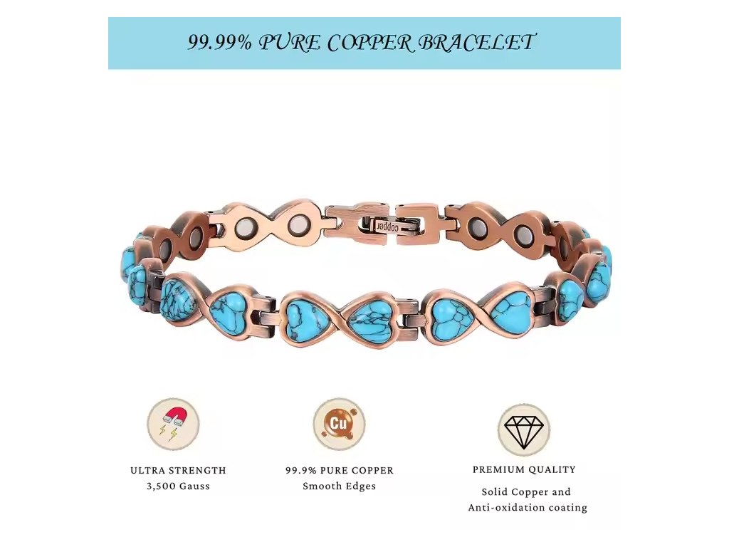 Náramek vyrobený z čisté mědi (99,9%), 100% hypoalergenní, ne slitiny ani mosazi, s průhledným povlakem. Obsahuje neodymové magnety o síle více než 2500 gaussů a drahé kameny (tyrkysové). Součástí balení je krásná šperkovnice a sada na zkracování.